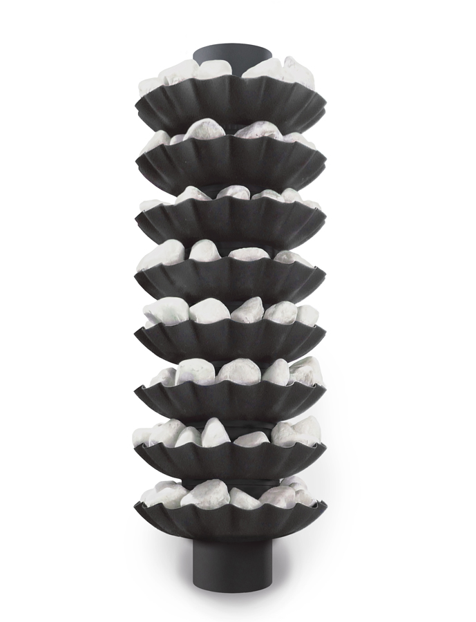 В конструкции отсутствуют элементы каких-либо сеток и решеток. Камни свободно располагаются вокруг горячего дымохода в элегантных чашах из нержавеющей стали. В верхней чаше встроено дождевальное устройство. Оно распределяет подаваемую воду тонкими душевыми струйками по всему периметру каменки так, что в парообразовании участвуют все камни, а не только с той стороны, откуда подается вода