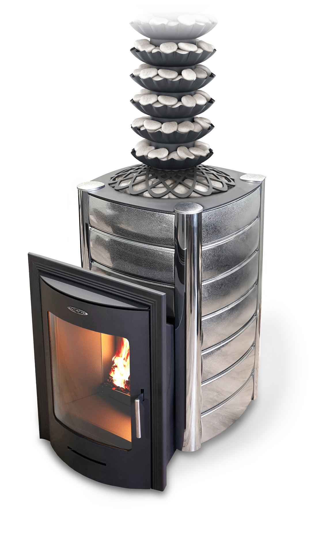 Натрубная каменка (в комплект поставки печи не входит) также является эффективным парогенератором, повторяет дизайн и функционал печи. Труба каменки выполнена из листовой жаростойкой стали AISI 439 толщиной 1 мм.